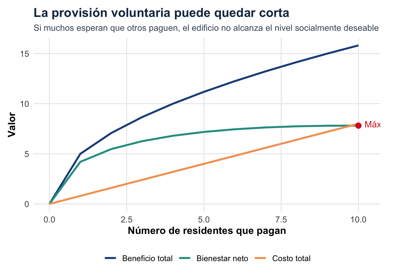 Reflexione: si las 10 familias son racionales e informadas, ¿por qué no llegan solas al acuerdo óptimo? ¿Qué fricciones o fallas de coordinación lo impiden?