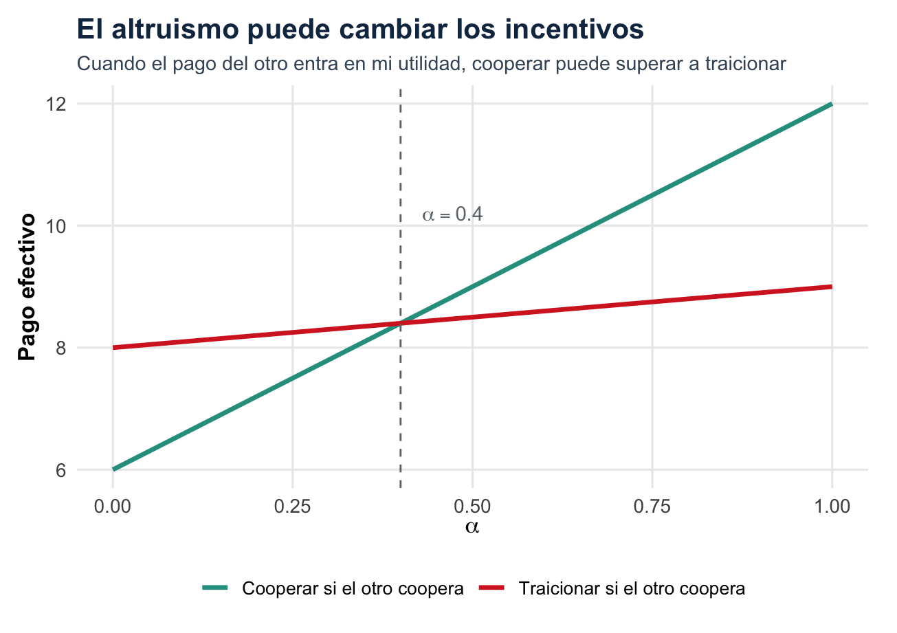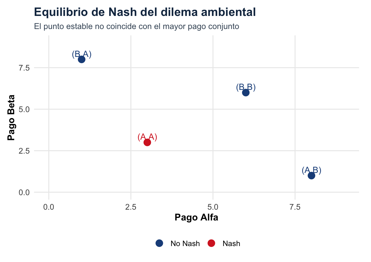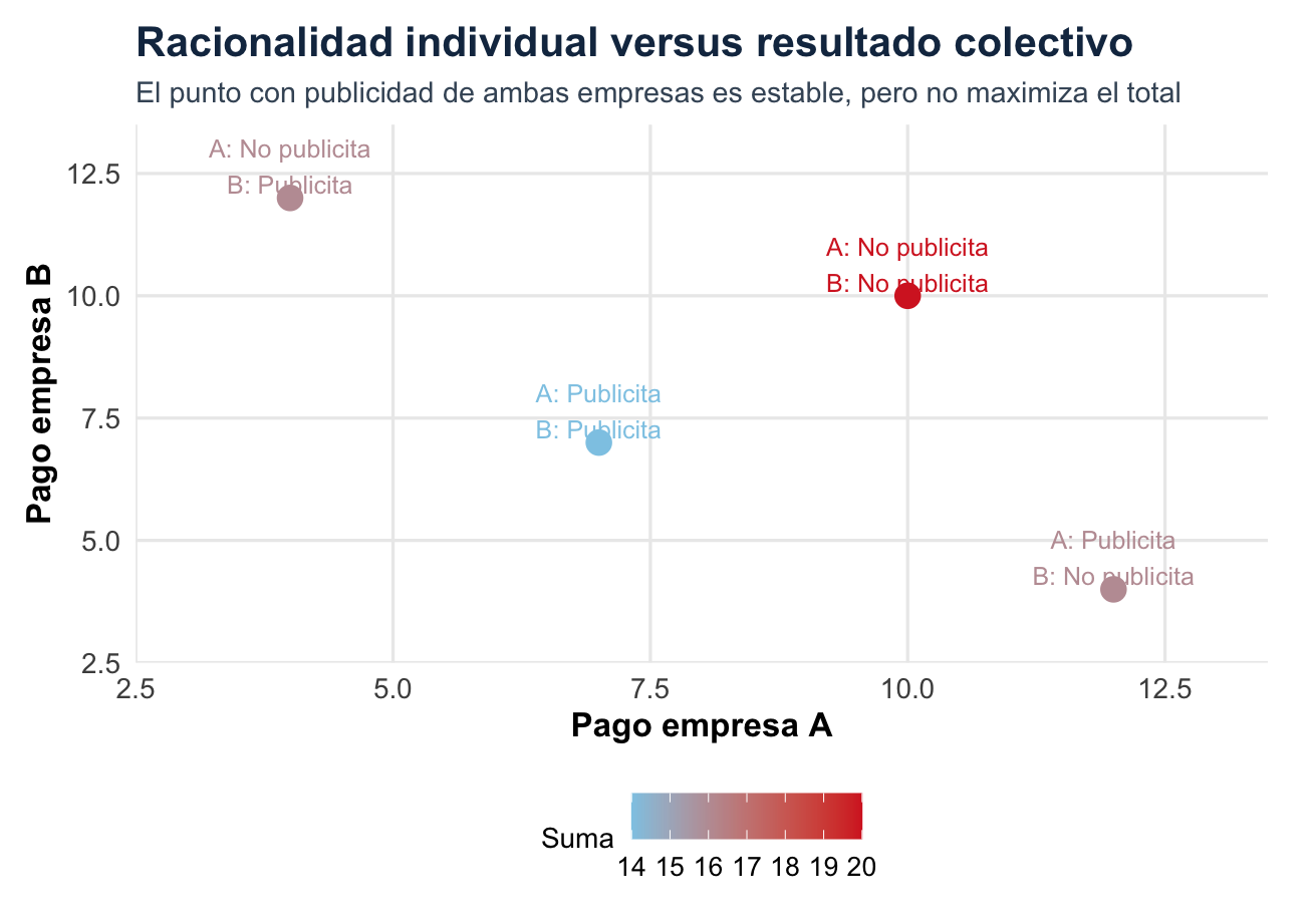La lección es central: racionalidad individual no garantiza bienestar colectivo. El equilibrio puede ser estable porque nadie quiere desviarse unilateralmente, aunque exista otra combinación que habría sido mejor para el grupo.