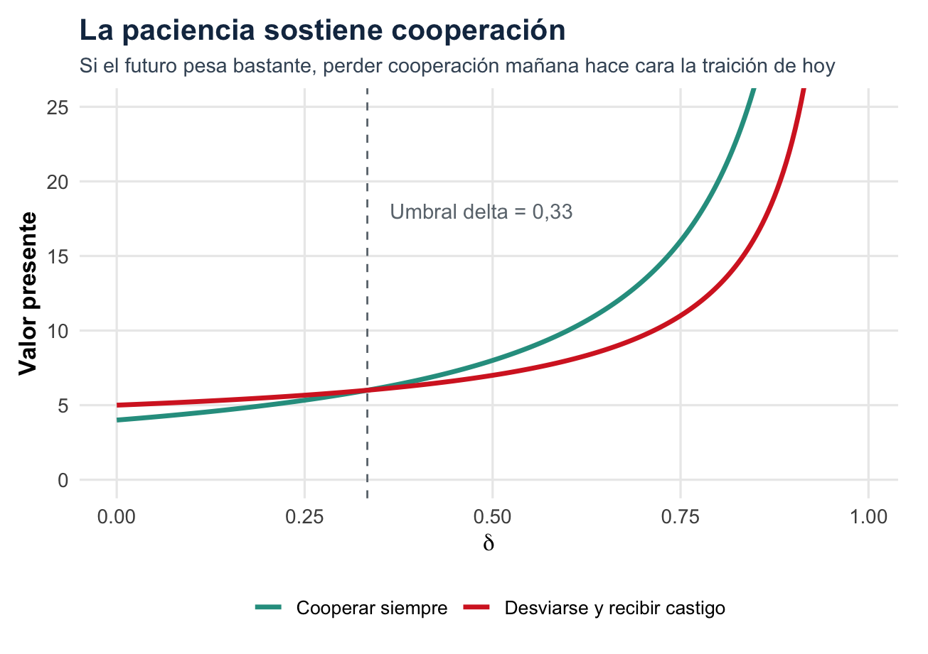 | Autogestión comunitaria | Sí, si δ es suficientemente alto | Repetición, monitoreo, confianza y castigo creíble |