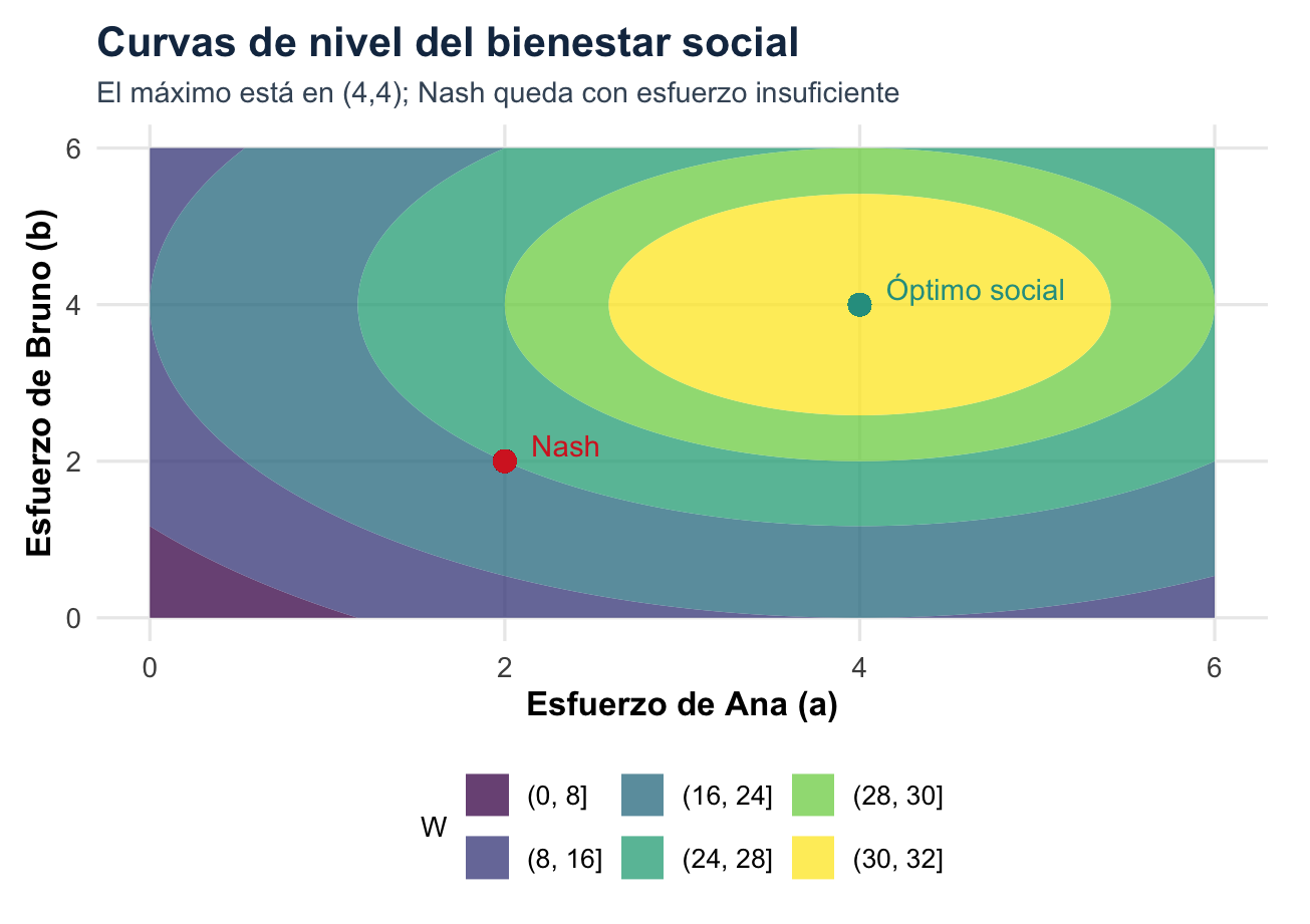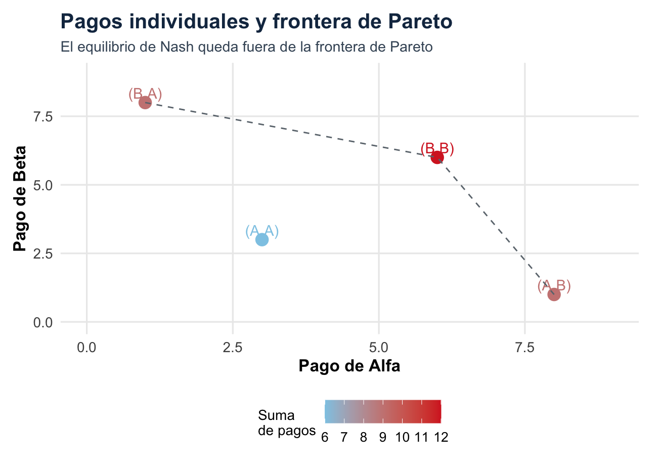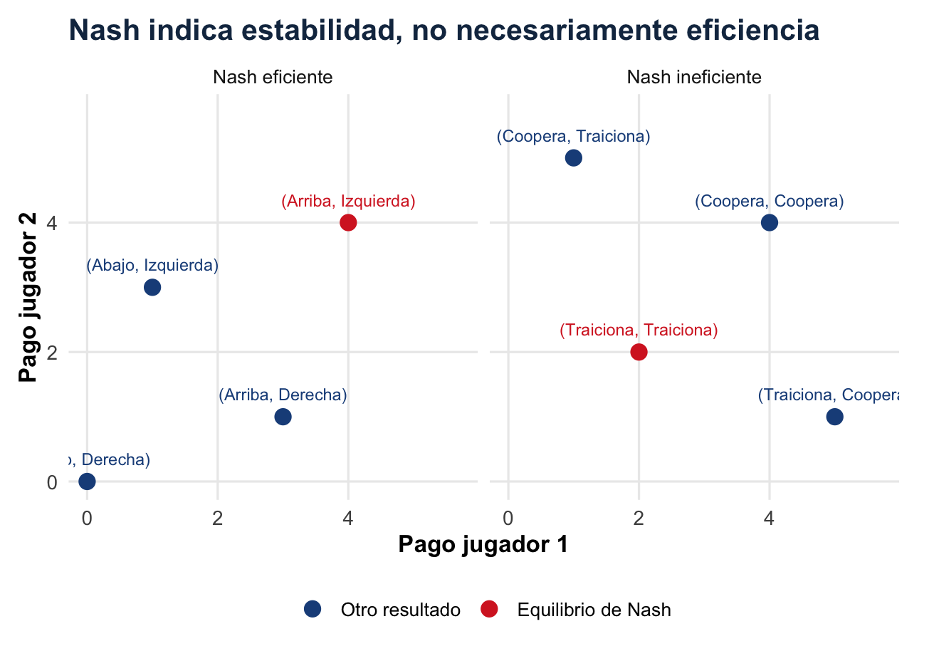 La propiedad importante es la no desviación unilateral rentable. El equilibrio es estable porque, dado lo que hacen los demás, cada jugador ya está haciendo lo mejor para sí mismo. Pero puede ser ineficiente en Pareto si existe otro resultado que mejora a alguien sin empeorar a nadie, o incluso mejora a todos.