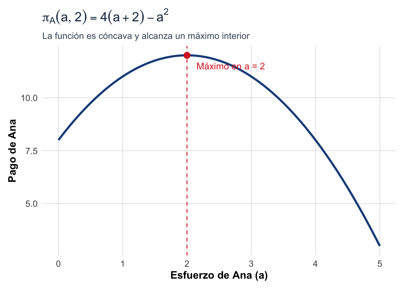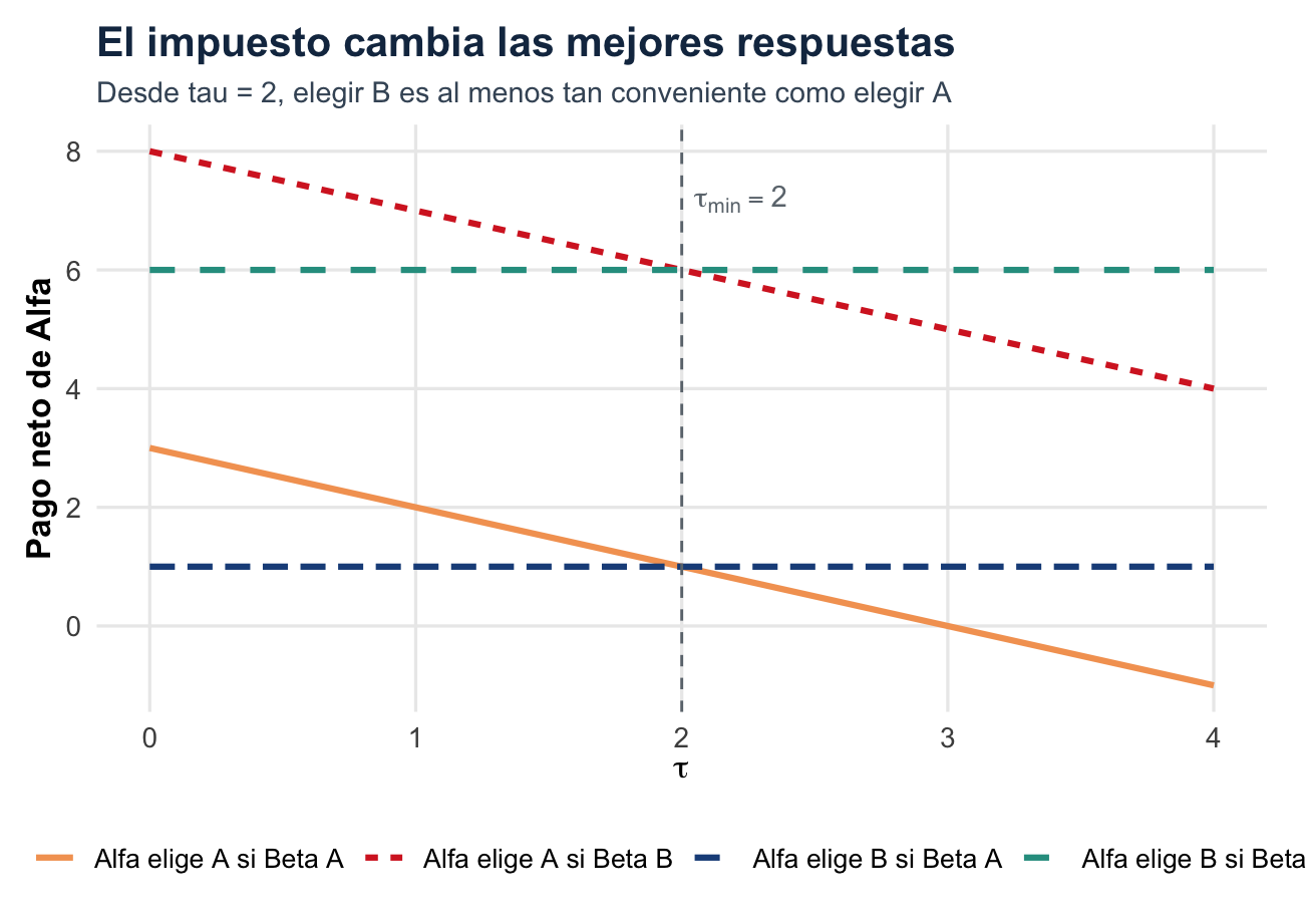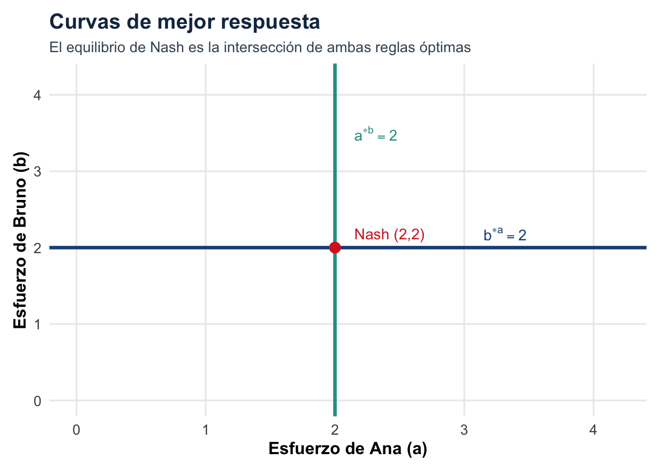 Por eso las herramientas del consumidor aislado no bastan. La tangencia entre una curva de indiferencia y una restricción presupuestaria sirve cuando el entorno se toma como fijo. En juegos estratégicos necesitamos describir mejores respuestas mutuas: qué me conviene hacer dado lo que tú haces, y qué te conviene hacer dado lo que yo hago.