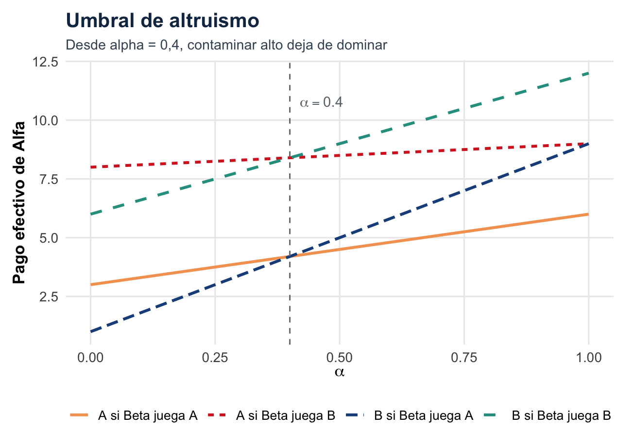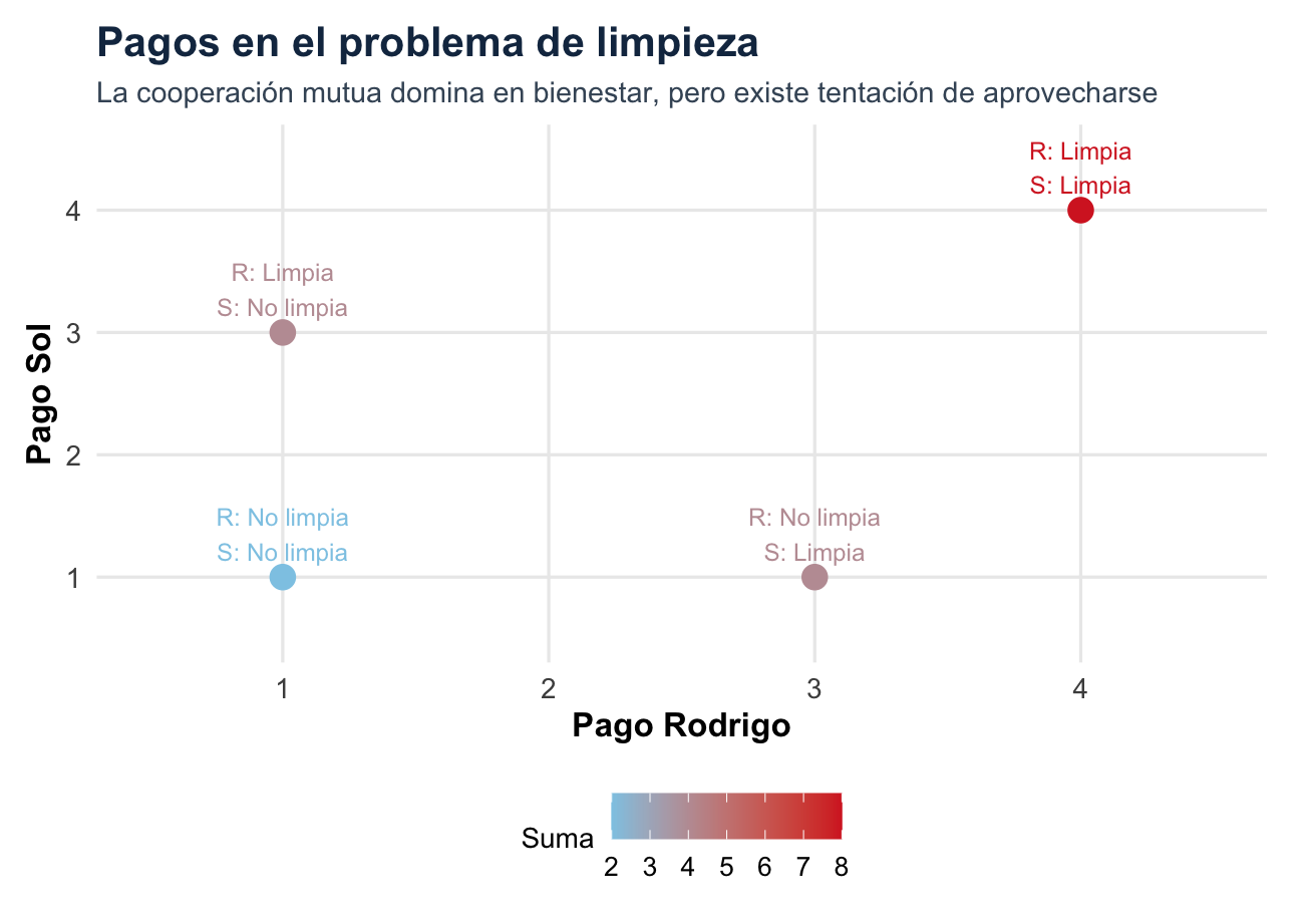 El resultado \((\text{Limpia},\text{Limpia})\) es Pareto superior a \((\text{No limpia},\text{No limpia})\), porque ambos pasan de 1 a 4. El dilema aparece porque existe una tentación de free rider: cuando el otro limpia, conviene no limpiar y recibir parte del beneficio sin asumir el costo.