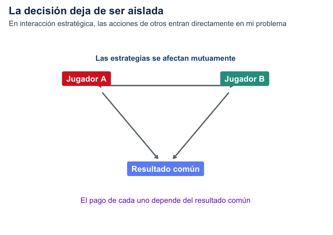 La nueva variable clave es la estrategia de los demás jugadores. Ya no basta con preguntar “¿cuál es mi mejor elección?”, sino “¿cuál es mi mejor elección dado lo que espero que hagan los otros?”.
