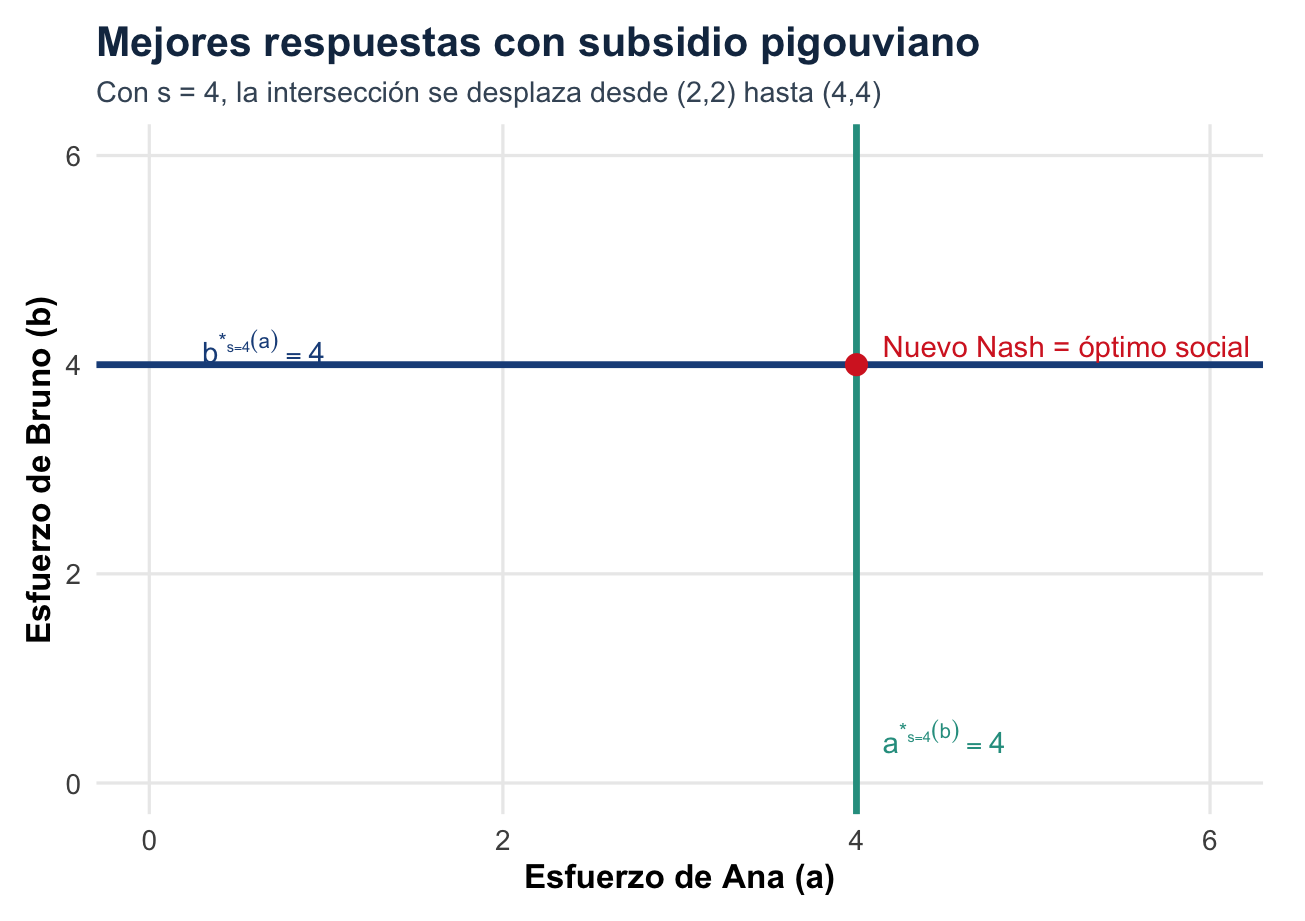 (Equilibrio de Nash: estabilidad, no óptimo.) Un economista define el equilibrio de Nash como “la mejor respuesta de cada jugador dada la estrategia del otro.” Un estudiante comenta: “Entonces el equilibrio de Nash debe ser el mejor resultado posible para todos.” Comente la afirmación del estudiante. ¿Es el equilibrio de Nash siempre eficiente en el sentido de Pareto? Construya un ejemplo sencillo (una matriz de pagos \(2 imes 2\)) en que el equilibrio de Nash es único pero no es óptimo de Pareto, y otro en que sí lo es. ¿Qué propiedad de estabilidad tiene el equilibrio de Nash aunque no sea eficiente?