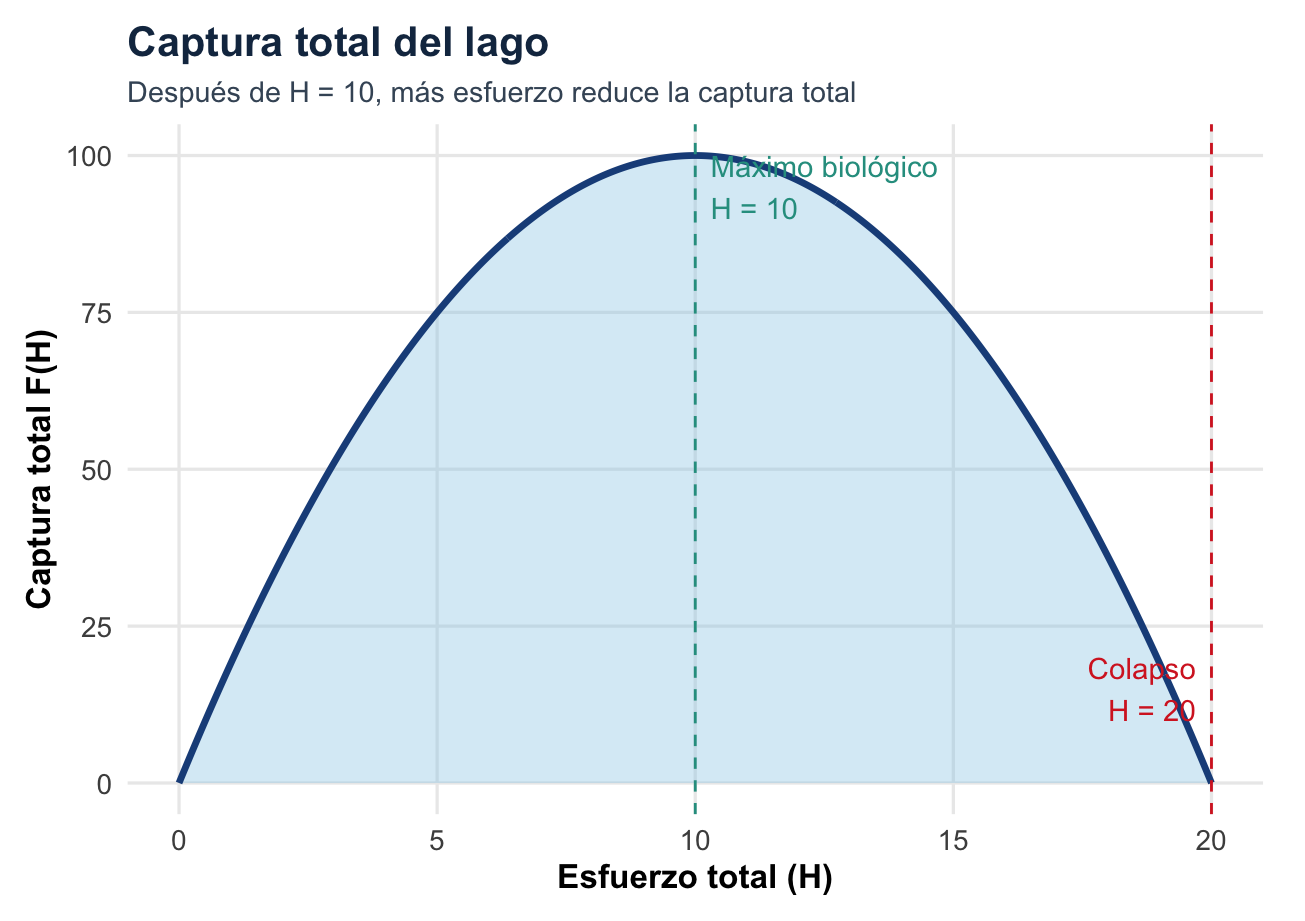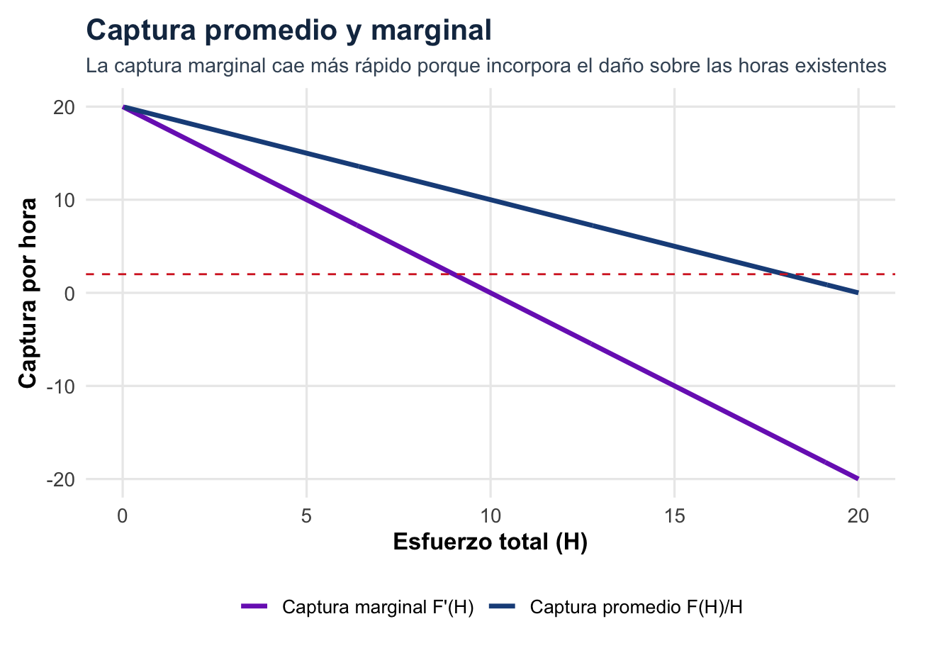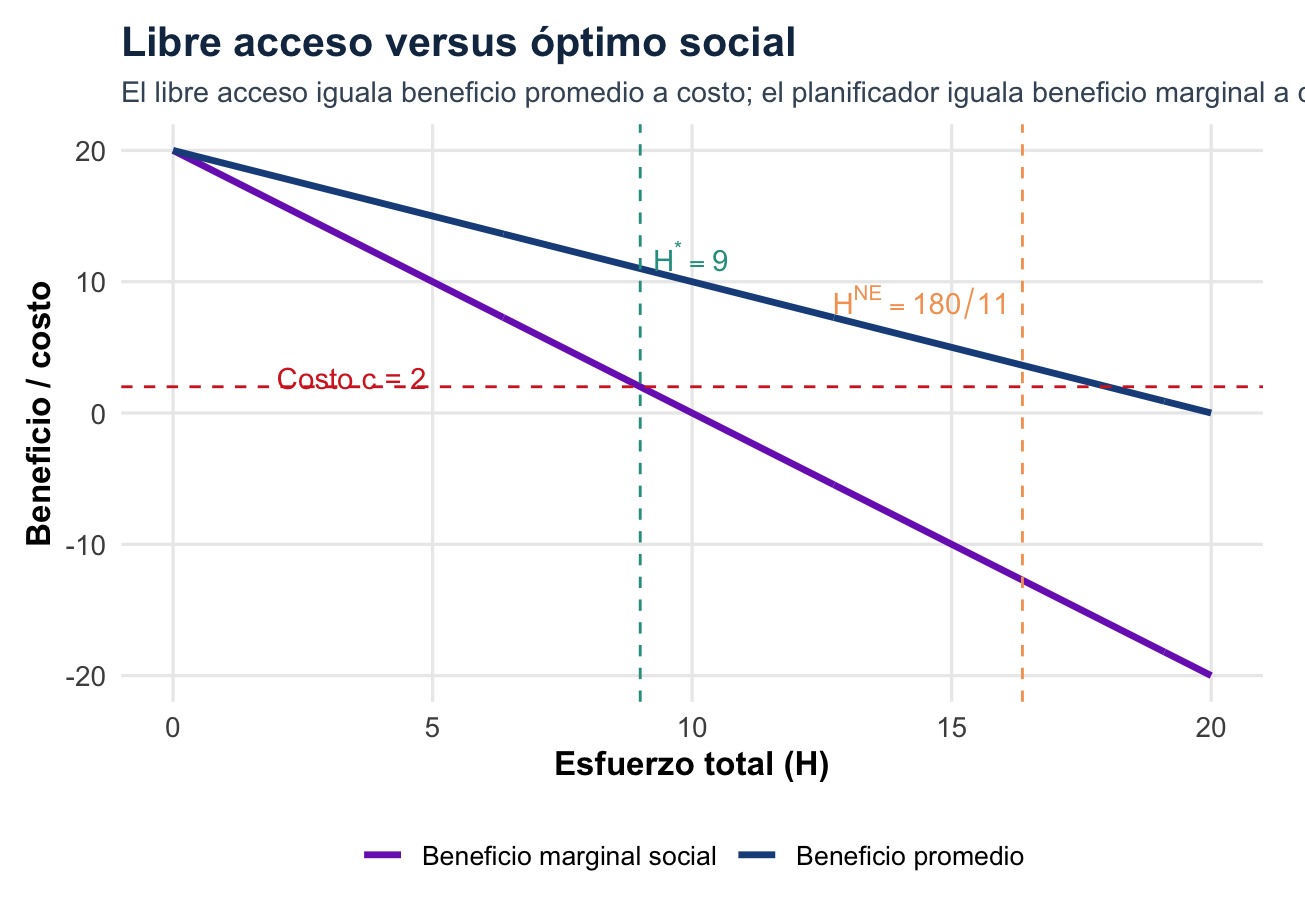 entonces el esfuerzo total será \(H^*=9\) si las 10 familias cumplen. Sí implementa el óptimo social, pero requiere información sobre la función de captura, el costo por hora, el número de familias y capacidad de monitoreo.
