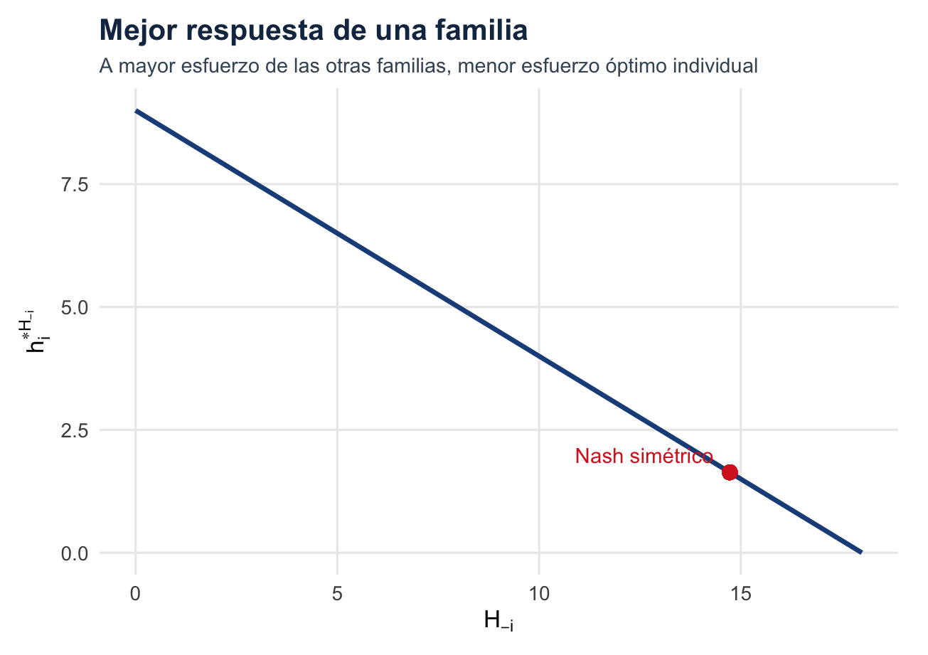 Si una familia se desvía una vez mientras las demás pescan \(0{,}9\), enfrenta \(H_{-i}=8{,}1\) y elige su mejor respuesta: