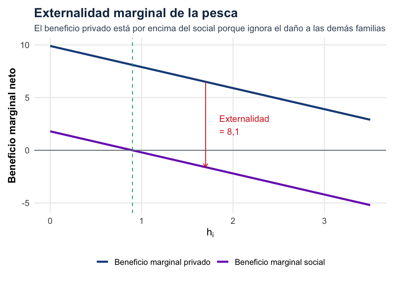 Es decir, cada otra familia pierde \(h_j\) unidades de captura neta. La externalidad total sobre las otras nueve familias es: