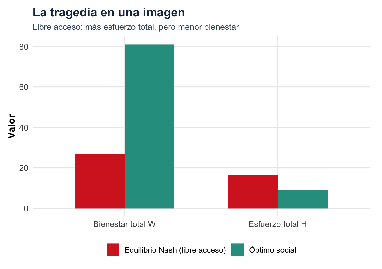 El libre acceso lleva a un esfuerzo mayor que el óptimo porque cada familia compara su beneficio privado con su costo privado, pero no considera que su esfuerzo reduce la captura de las otras nueve. Como todas hacen lo mismo, el esfuerzo agregado sube demasiado y el bienestar total cae.