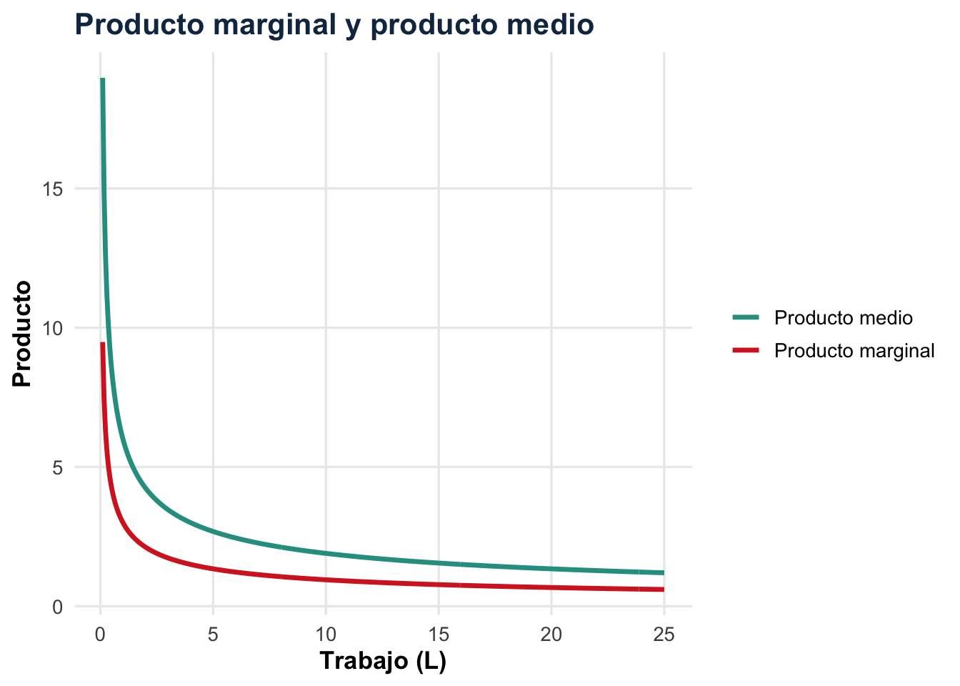 Aquí el producto medio siempre duplica al marginal.