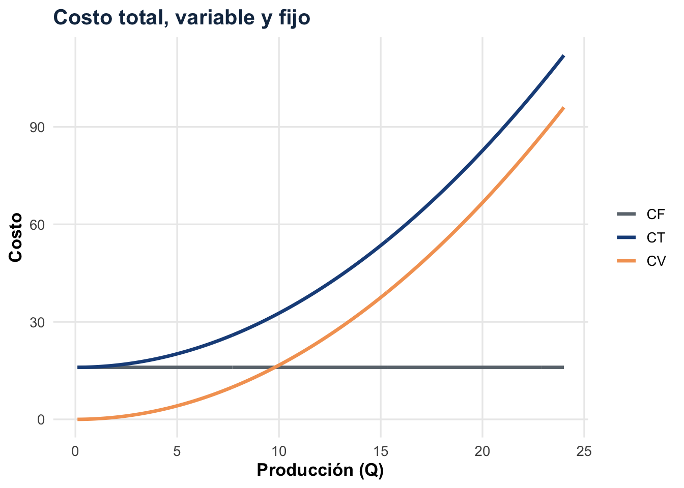 La distancia vertical entre \(CT\) y \(CV\) es siempre 16: ese es el costo fijo.