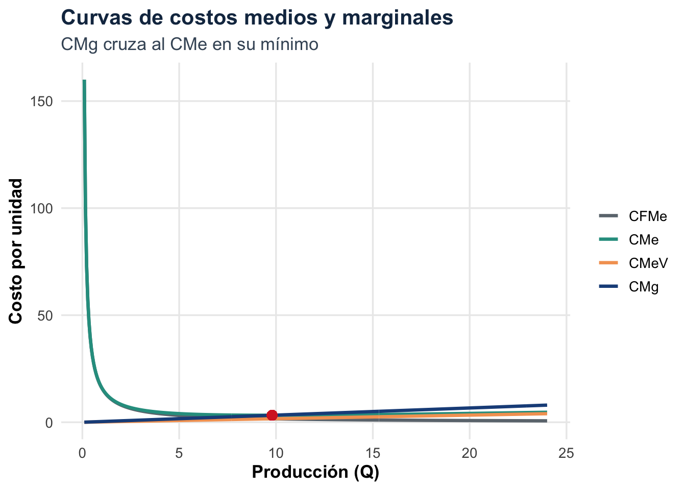 Los costos fijos no afectan al costo marginal, porque no cambian cuando la empresa produce una unidad más. Sí afectan al costo medio total, sobre todo a bajas cantidades. A medida que \(Q\) crece, el costo fijo medio se diluye y el CMe se acerca al CMeV.