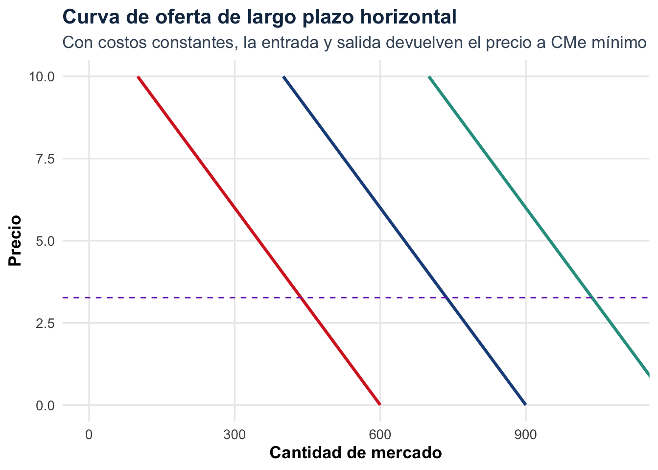 En el corto plazo la oferta de mercado suele tener pendiente positiva. En el largo plazo, con costos constantes, la entrada y salida hacen que la oferta de la industria sea horizontal al precio de equilibrio de largo plazo.